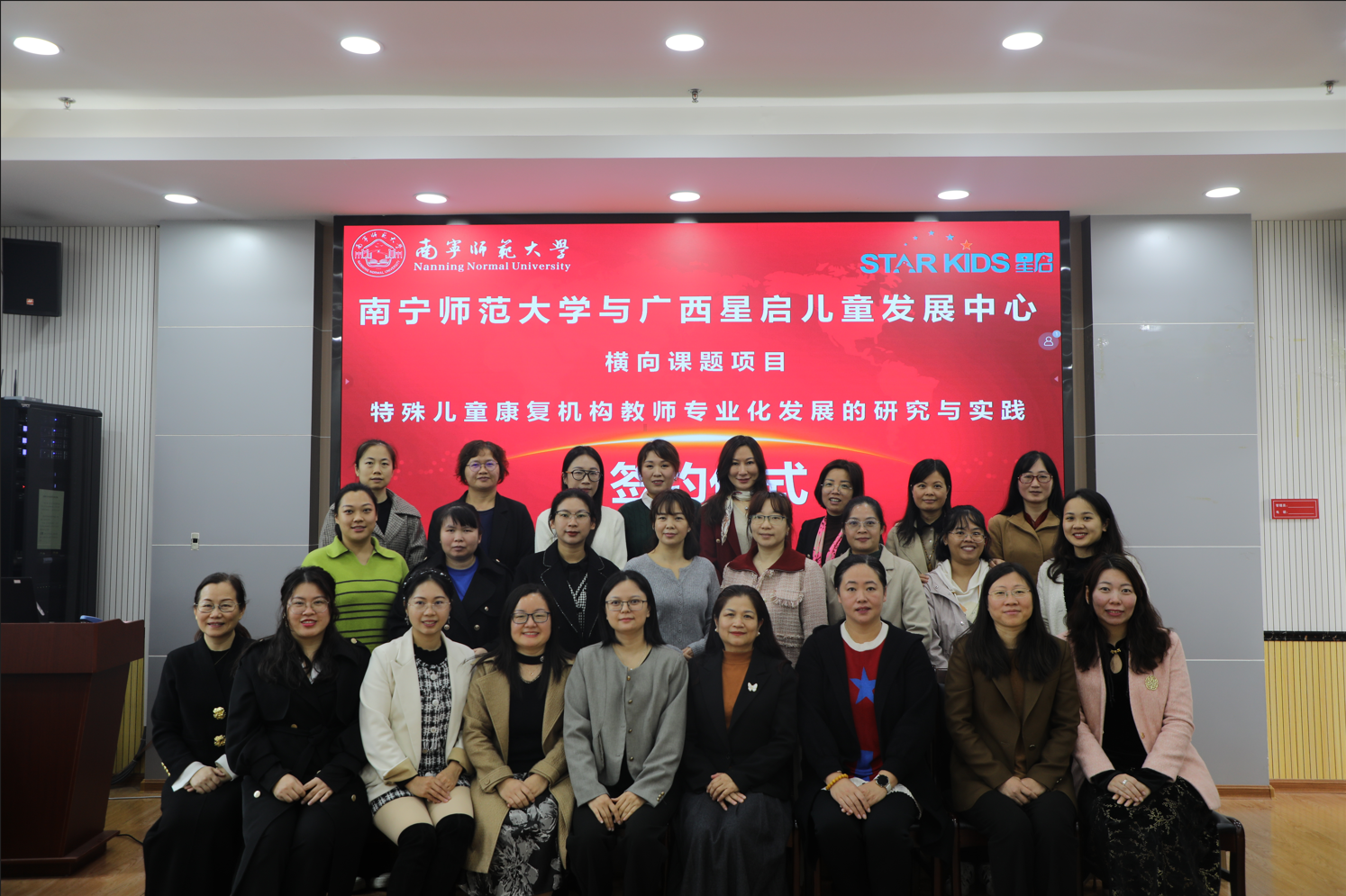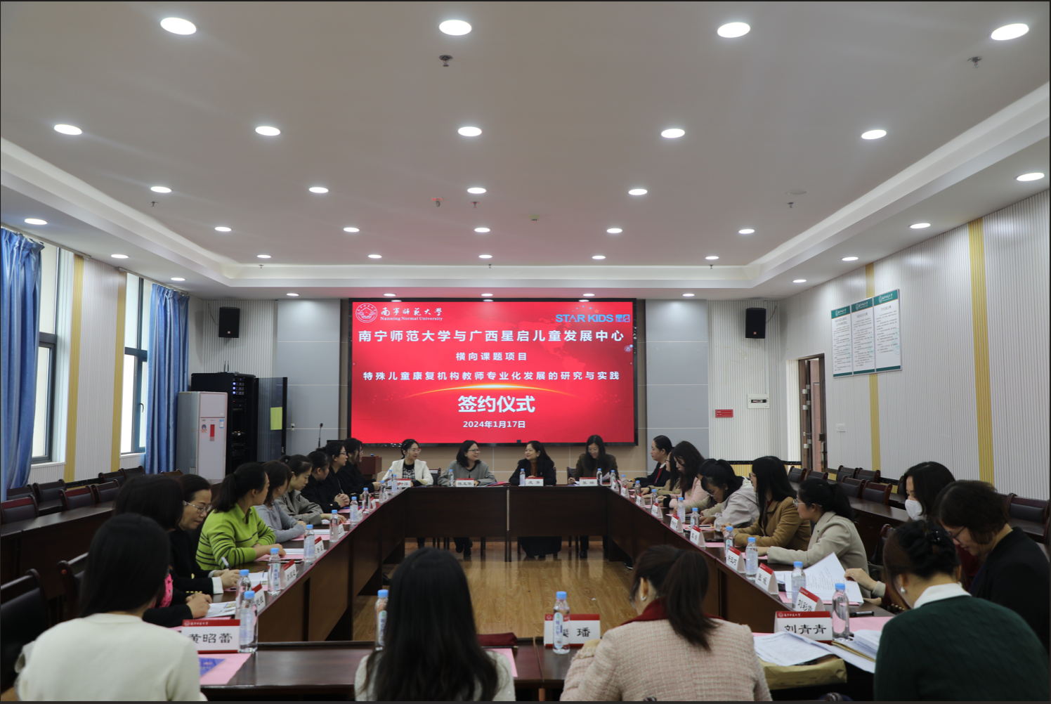 2024年1月17日,william威廉英国官网与广西星启儿童发展中心举行横向课题项目“特殊儿童康复机构教师专业化发展的研究与实践”的签约仪式,签约仪式在william威廉英国官网五合校区理楼1003室举行。