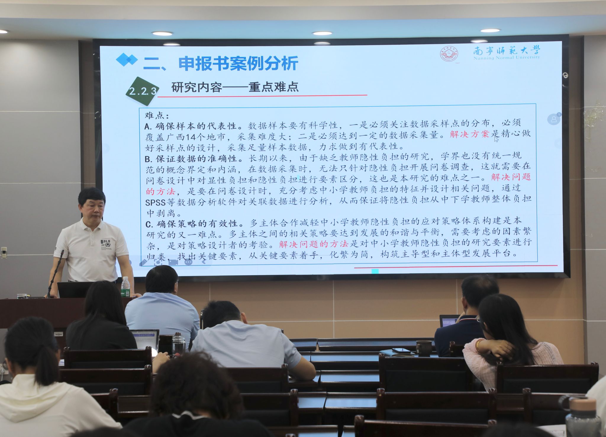 莫运佳研究员结合申报和管理经验,围绕往年的立项情况,就2024年值得关注的选题方向、撰写课题申报书的注意事项等方面进行了重点讲解与指导,并以申报书案例剖析,指导老师们规范填写申报书,同时强调填写过程中需要注意的重点事项。他指出,课题选题应符合国家战略和社会需求,紧密关注国家教育政策、学科的前沿问题和发展动态,密切结合学科专业建设和课堂教学改革实际,突出教育的本质和价值性,不断提高学术深度和高度。此次讲座既有理论引领,又有案例分析,对提高申报书的质量具有重要指导意义,在场的老师受益匪浅。