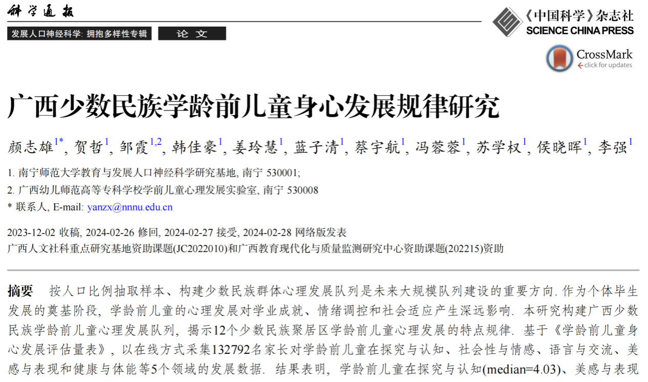 近日,公司william威廉英国官网颜志雄教授团队以william威廉英国官网为第一署名单位在《科学通报》发展人口神经科学: 拥抱多样性专辑上发表题为“广西少数民族学龄前儿童身心发展规律研究”的研究论文。