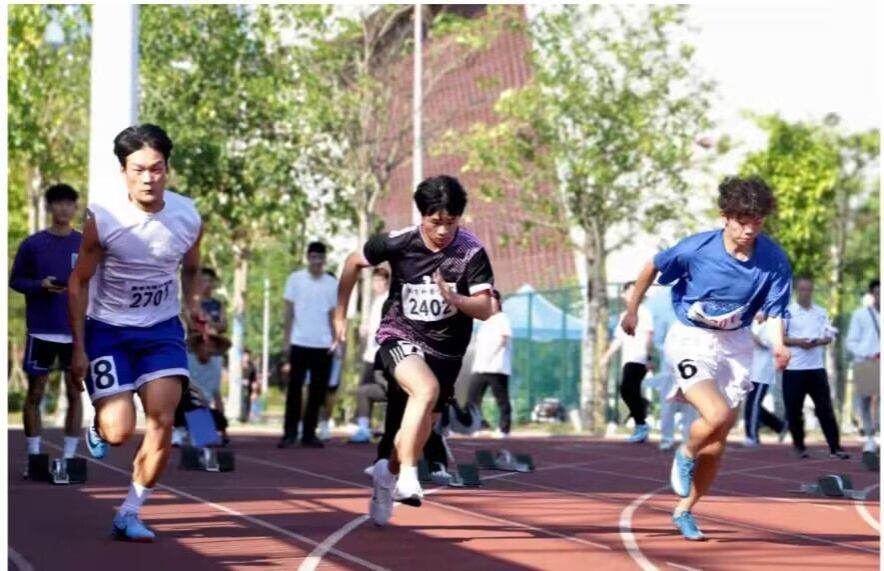 运动会开幕式上,各院级队伍,国旗手以及彩旗方阵陆续进场,锵铿有力的步伐,高亢嘹亮的口号,生动地展现了当代青年朝气与风采。开幕式结束,各比赛项目立即展开。田径赛场上,男女20*60混和接力赛,1500米长跑,短跑,立定跳远,女子高杆投绣球陆续开展。赛场上,运动员们或矫健如飞,或稳健如山,在彩旗飘扬,人声鼎沸 ,展现出了“永不言败,飞跃自我”的惊人风采。百米赛道上,运动员们如离弦之箭,瞬间爆发出惊人的速度与力量,那是对"速度决定成败"最生动的诠释;跳远沙坑旁,健儿们以优美的姿态划破空气,留下一道道绚丽的弧线,那是对"超越自我,挑战极限"的最好证明 。