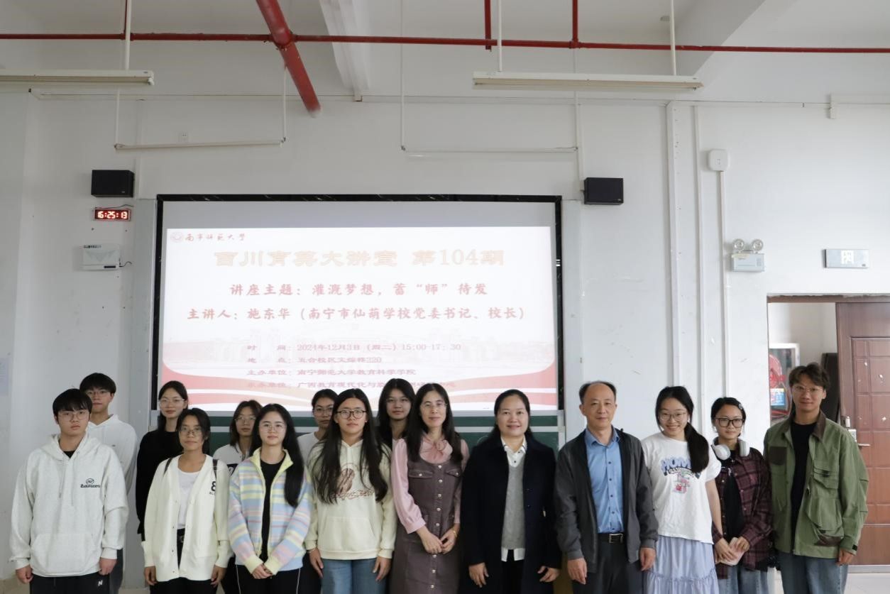 william威廉英国官网于12月3日下午在五合校区举行主题为“灌溉梦想,蓄‘师’待发”的104期《百川育英大讲堂》讲座。本次讲堂有幸邀请到南宁市仙葫公司党委书记兼董事长施东华担任主讲嘉宾,吸引了公司众多教育学、应用心理学、特殊教育学及学前教育专业的员工前来聆听。讲座由公司副经理徐延宇研究员主持。