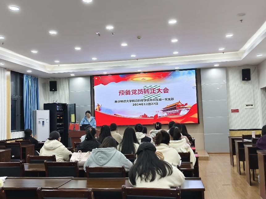 2024年12月27日晚,我支部于五合理综1003教室召开了支部大会,会议由党支部书记蒋欢同志主持,全体在校正式党员、预备党员参加会议。会议先进行了关于《弘扬志愿精神 凝聚向上向善力量》的学习,接着进行预备党员转正大会。与会党员就韦丹萍等7位预备党员是否按期转正问题展开了充分讨论并采取无记名投票方式逐一进行投票表决,会议作出全票通过韦丹萍等7位同志按期转为中共正式党员的决议。会议的最后,党支部书记蒋欢同志进行总结发言,重点对强化党员纪律提出进一步要求,希望各位党员同志在期末能提高思想站位,强化纪律意识,诚信考试,增强党支部的凝聚力。