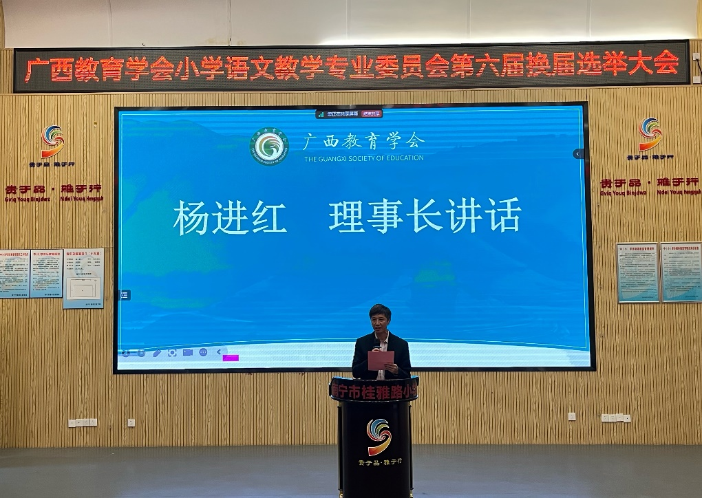 专委会新一届理事长杨进红发表讲话。杨进红代表新一届理事会,对上一届理事会工作给予了高度的评价,向一直以来关心和支持广西小语会工作的各级领导、专家学者以及广西小语届同仁表示最诚挚的感谢。针对新一届理事会的工作愿景,他建议聚焦以下四个方面去思考与探索:一是持续增强广西小语会的凝聚力和影响力,打破区域、校际壁垒,形成合力,聚焦专题,孵化成果,打造具有广西本土特色的小学语文教学与研究共同体;二是以新课标、新教材、新评价的改革创新为抓手,通过组织学习研讨会,提升小语教师应用新技术、新方法、新思维的素养;三是进一步拓展学术交流的渠道,通过举办年会、研讨会、论坛等学术活动,促进会员之间的交流与合作,扩大教师的工作圈与学术圈;四是搭建教师专业成长的“立交桥”,组织公司产品研究活动,推动小语教师走专业发展之路,提升教师队伍的整体素质。