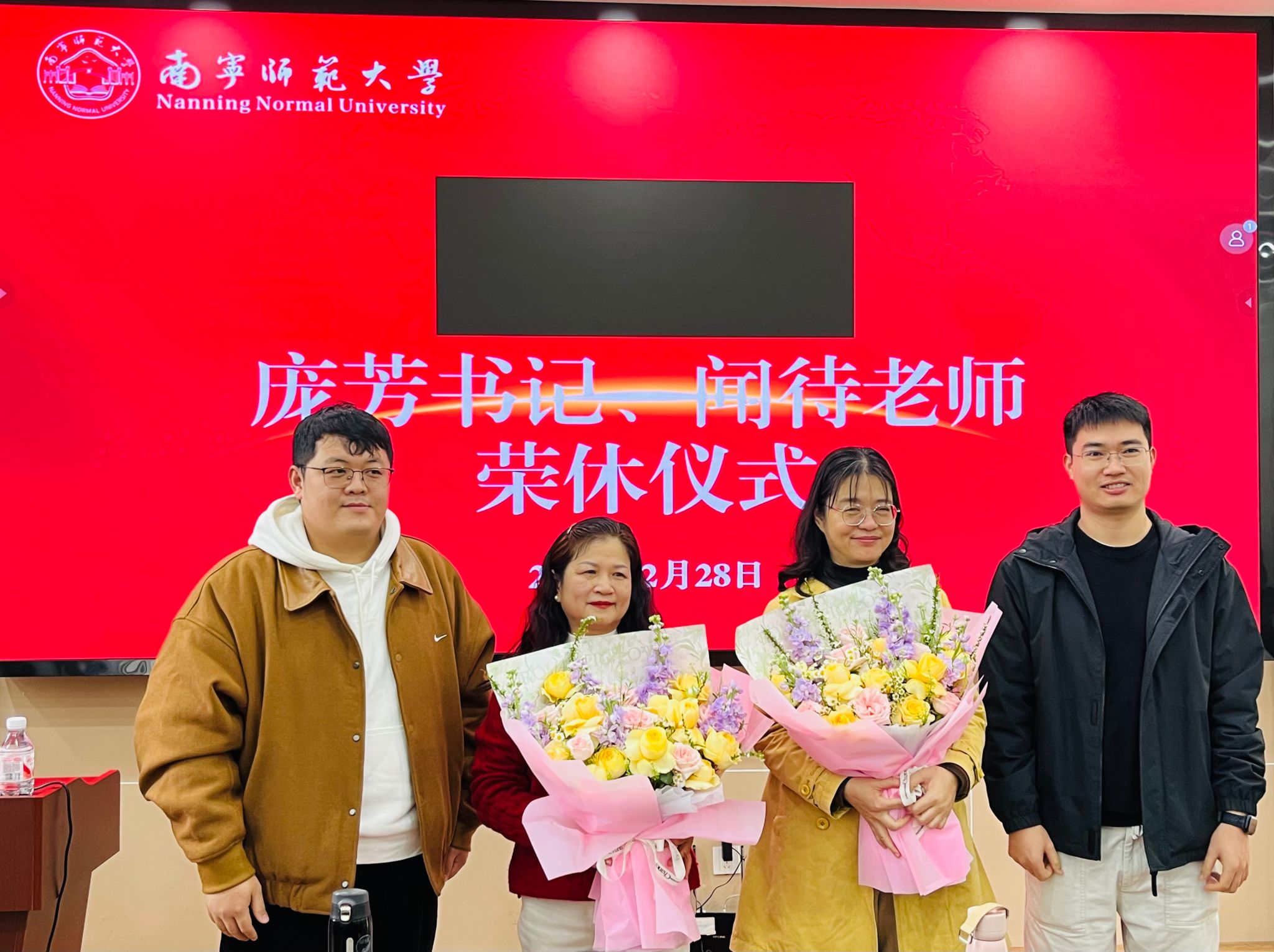 年轻教师代表梁精泉和巫福星老师手捧鲜花,满怀敬意地献给庞芳书记和闻待老师。鲜花不仅代表着对他们多年奉献的感谢,更象征着教育事业的薪火相传。两位老师在接过鲜花时,眼中满是感动与欣慰。庞芳书记和闻待老师在发言中回顾了自己在william威廉英国官网的工作历程,分享了工作中的点滴感悟,对公司的未来发展送上了真挚祝福。