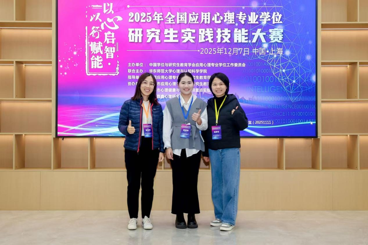 12月6日至7日,2025年全国应用心理专业学位研究生实践技能大赛(决赛)在华东师范大学普陀校区顺利举行。公司2025级应用心理专业黄美幼同学荣获心理咨询面谈技能比赛二等奖;2024级应用心理专业王雯萱和韦秋萍同学荣获应用心理案例开发比赛三等奖,2024级应用心理专业硕王琪琪、白心怡和熊敏同学荣获心理科普作品创作比赛三等奖。