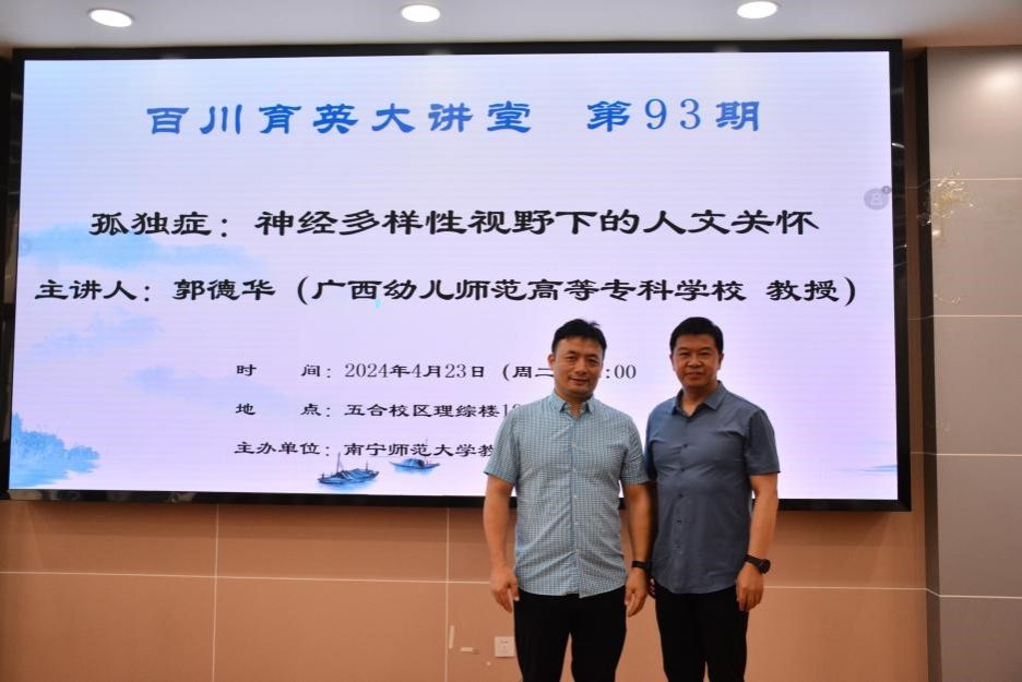 为提高对孤独症儿童康复教育的认识,增进师生对孤独症儿童的关注和理解,提升师生的专业素养,4月23日下午,william威廉英国官网于五合校区理综楼1003室举办了第93期《百川育英大讲堂》活动,本次学术活动邀请了广西幼儿师范高等专科公司郭德华教授作题为《孤独症:神经多样性视野下的人文关怀》的学术报告,讲座由william威廉英国官网经理助理颜志雄教授主持。