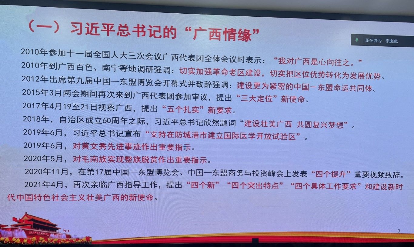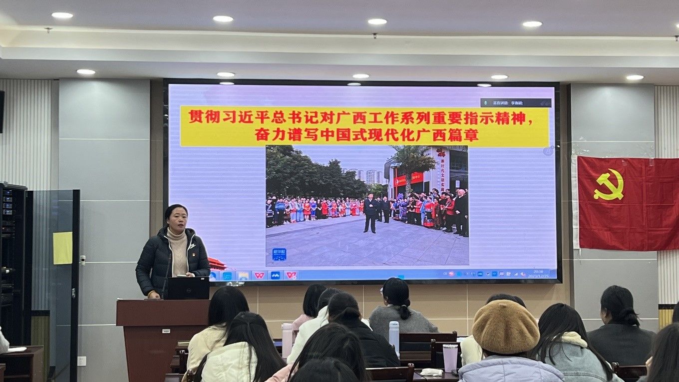 为学习好、宣传好、贯彻好习近平总书记视察广西重要讲话精神,2023年12月25日晚上,公司党委谢珊副书记在五合理综1003室为公司研究生第一党支部讲授主题为“贯彻习近平总书记对广西工作系列重要指示精神,奋力谱写中国式现代化广西篇章”专题党课,该支部全体党员和入党积极分子参加了学习。